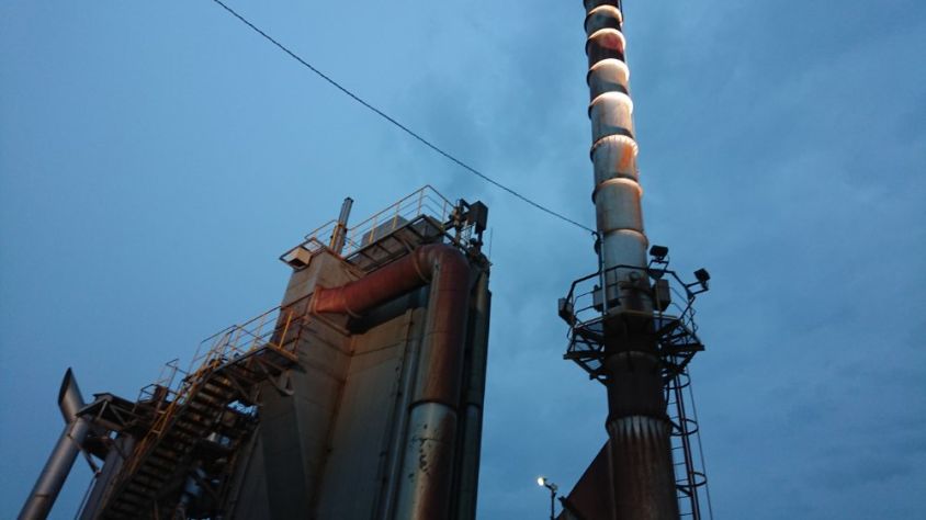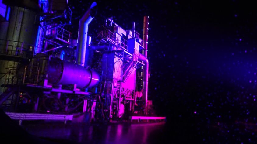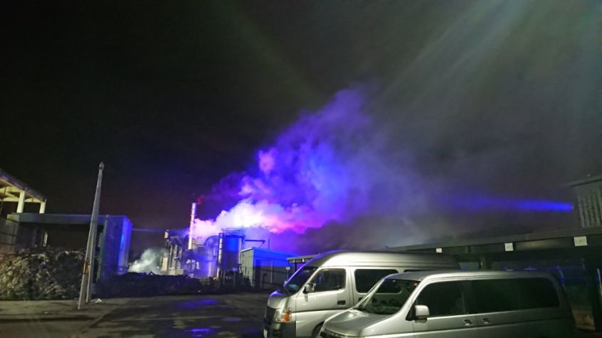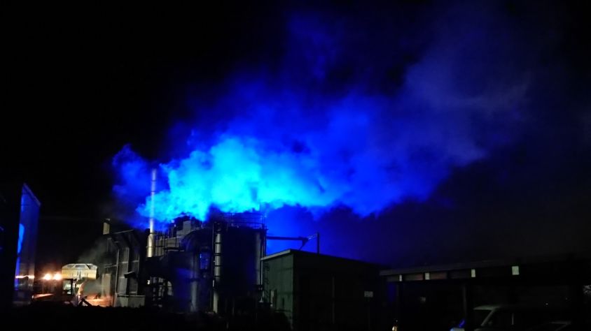 水蒸気や煙突や工場が照明で浮き上がります。